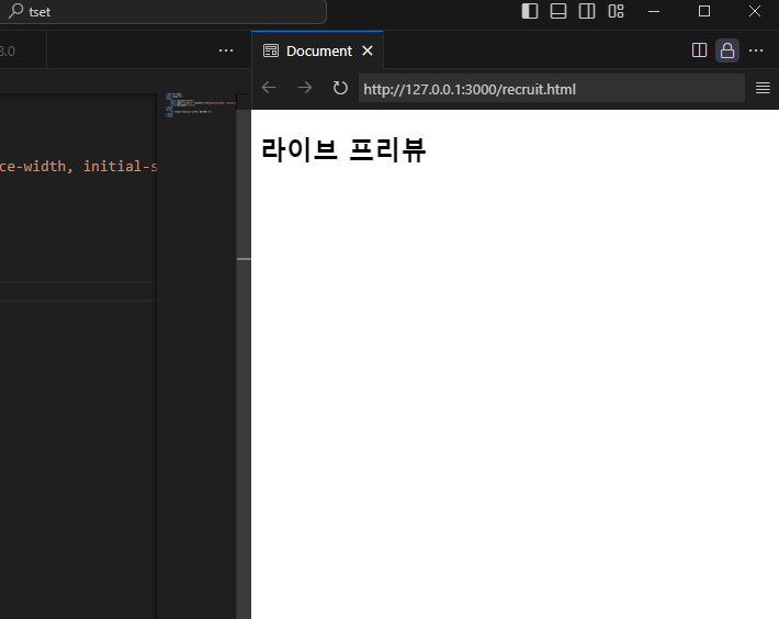 vscode내부에서 Document라는 새로운 창을 띄워 현재 작업 결과물을 실시간으로 보여줍니다. 작업창 오른쪽의 스크롤바와 Document창의 경계선 부분을 드래그하면 Document창 의 크기를 조절할 수도 있습니다.