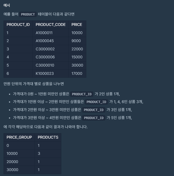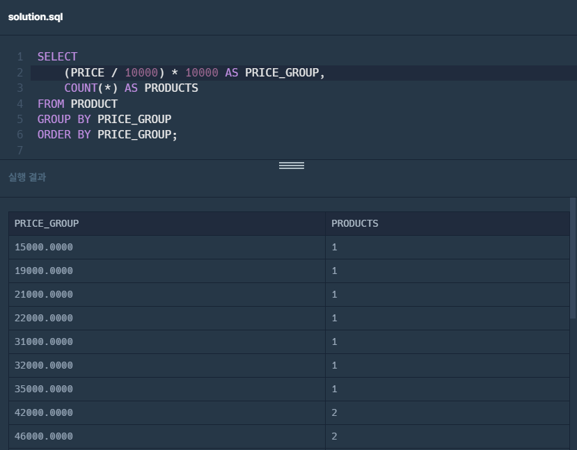 처음에 FLOOR()을 안했더니 천원 단위로 구간이 나뉘고, 소수점 넷째자리까지 표시되는 문제가 있었다. 이런 현상이 발생하는 이유는 PRICE / 10000을 했을 때 정수 나눗셈이 아니라 실수 나눗셈이 되서 그렇다.
