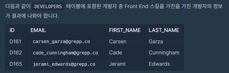 - DEVELOPERS 테이블에서 한 명의 개발자가 SKILL_CODE에 여러 개의 Front End 기술을 가지고 있으므로 FRONT_SKILLS의 여러 행과 매칭되서 1인 : FRONT_SKILLS N개와 JOIN되는 결과가 발생한다. 그래서 같은 개발자가 여러 줄로 출력된다.