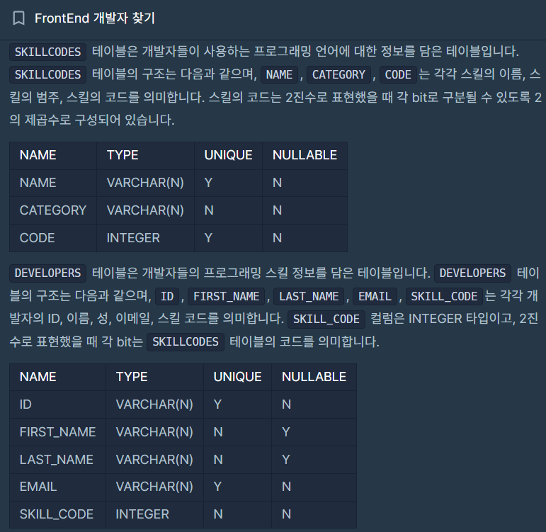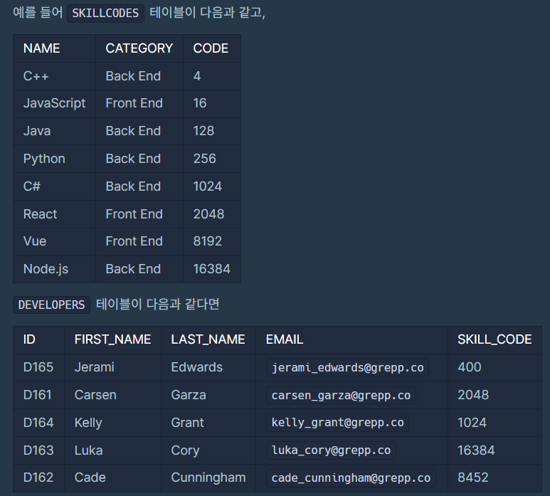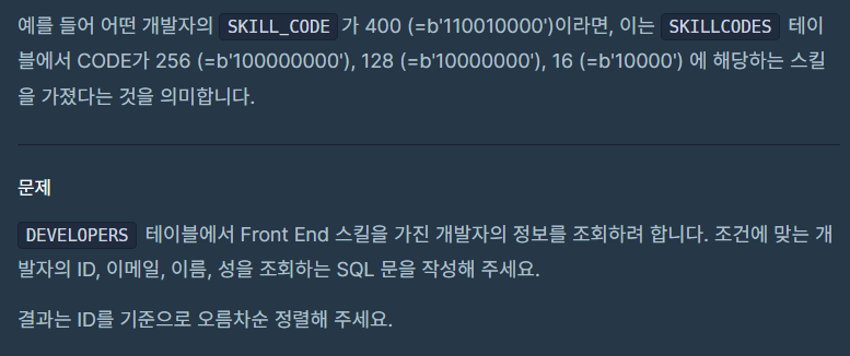 - DEVELOPERS.SKILL_CODE와 SKILLCODES.CODE를 비트 AND 연산해서 0보다 크면 Front End 스킬 보유자임