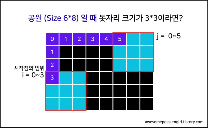 쉽게 말하면, 여기서 시작점 탐색은 공원 배열 park에서 돗자리 왼쪽 위 모서리 위치를 정하는 과정이다. 돗자리를 어디에 놓을지 기준점을 (i, j)로 잡는 것이다. 이 과정이 중요한 이유는 돗자리 한 변 길이를 k라고 하면, (i, j)가 시작점일 때 돗자리가 공원을 벗어나면 안 되기 때문에 아래와 같이 범위를 설정해 준다.
