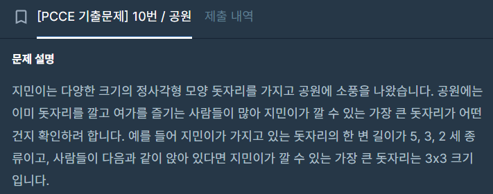 - 목표 : 공원에서 사람이 없는 영역("-1")을 찾아서, 지민이가 가진 돗자리 중 가장 큰 크기를 깔 수 있는지 확인하는 코드짜기