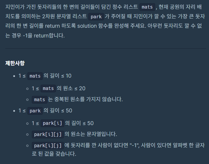 - mats : 지민이가 가진 돗자리 크기가 담긴 배열이다. 각 요소는 한 변의 길이