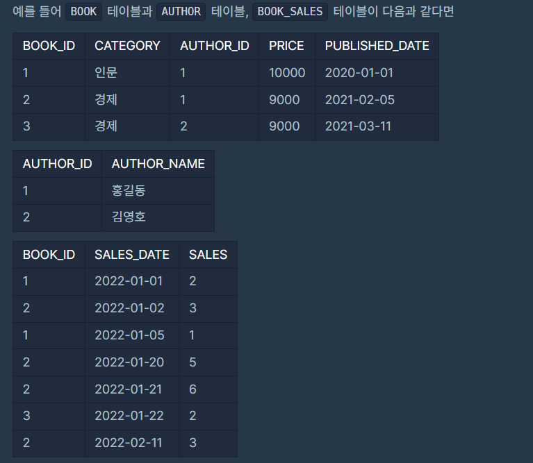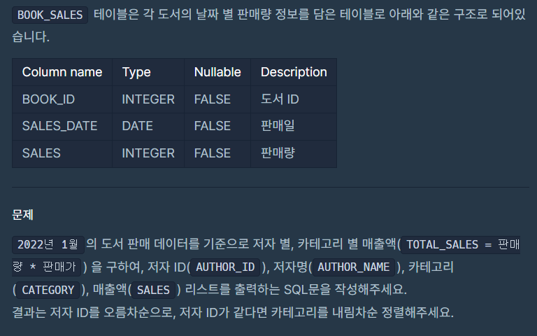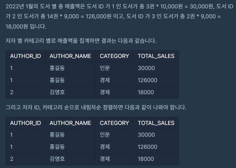 즉, SUM, COUNT 같은 집계함수가 아닌 a.AUTHOR_ID, a.AUTHOR_NAME, b.CATEGORY는 전부 GROUP BY에 넣어야 한다. 그럼 AUTHOR_NAME을 안 넣으면 아예 쿼리가 안 돌아가나 안 되나? 하는 생각이 드는데, 보통 AUTHOR_ID가 기본키(고유값)라면, 이걸로만 그룹핑해도 같은 그룹 안에 항상 같은 AUTHOR_NAME이 따라온다고 한다.