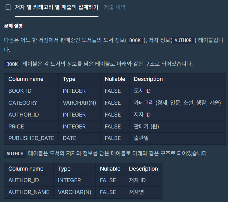'작가별 + 카테고리별 총 매출'이니까 AUTHOR_ID, CATEGORY로 그룹핑하는 것은 당연하다.