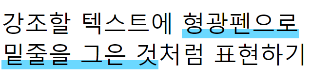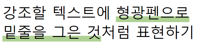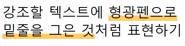 <p>강조할 텍스트에 <span class="emphasis">형광펜으로<br>밑줄을 그은 것</span>처럼 표현하기</p>