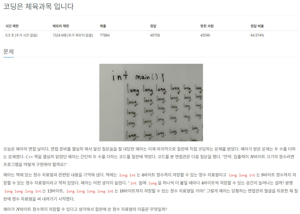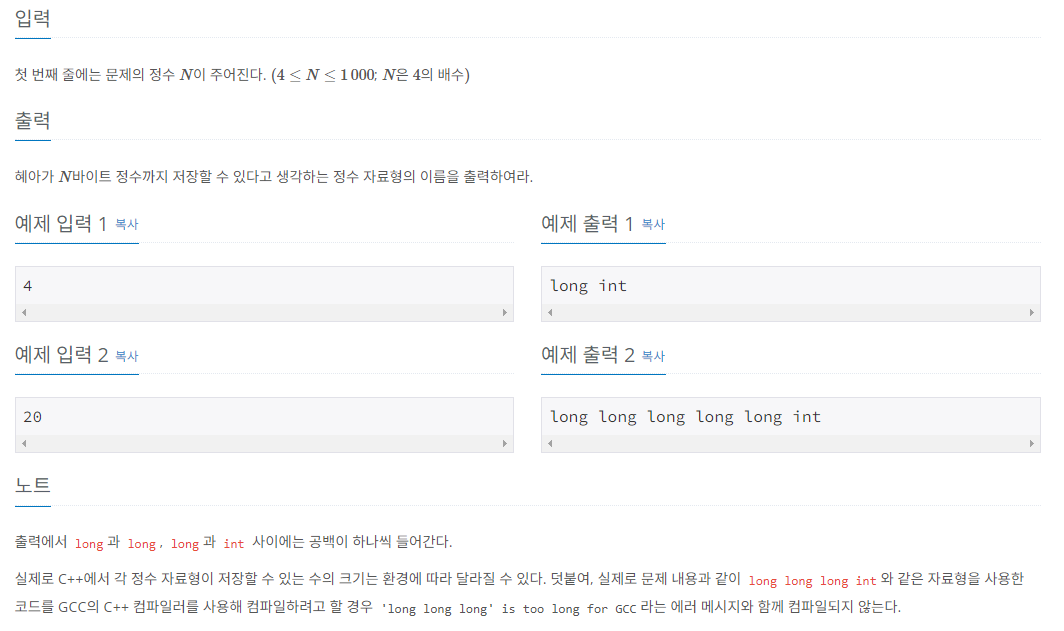 혜아가 N바이트 정수까지 저장할 수 있다고 생각해서 칠판에 쓴 정수 자료형의 이름은 무엇일까?(코딩 공부를 잘 하여 이렇게 long long long long...을 칠판에 적는 일이 없도록 합시다.)