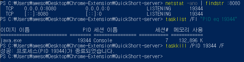 확인해보니까 PID 19344가 포트 점유중