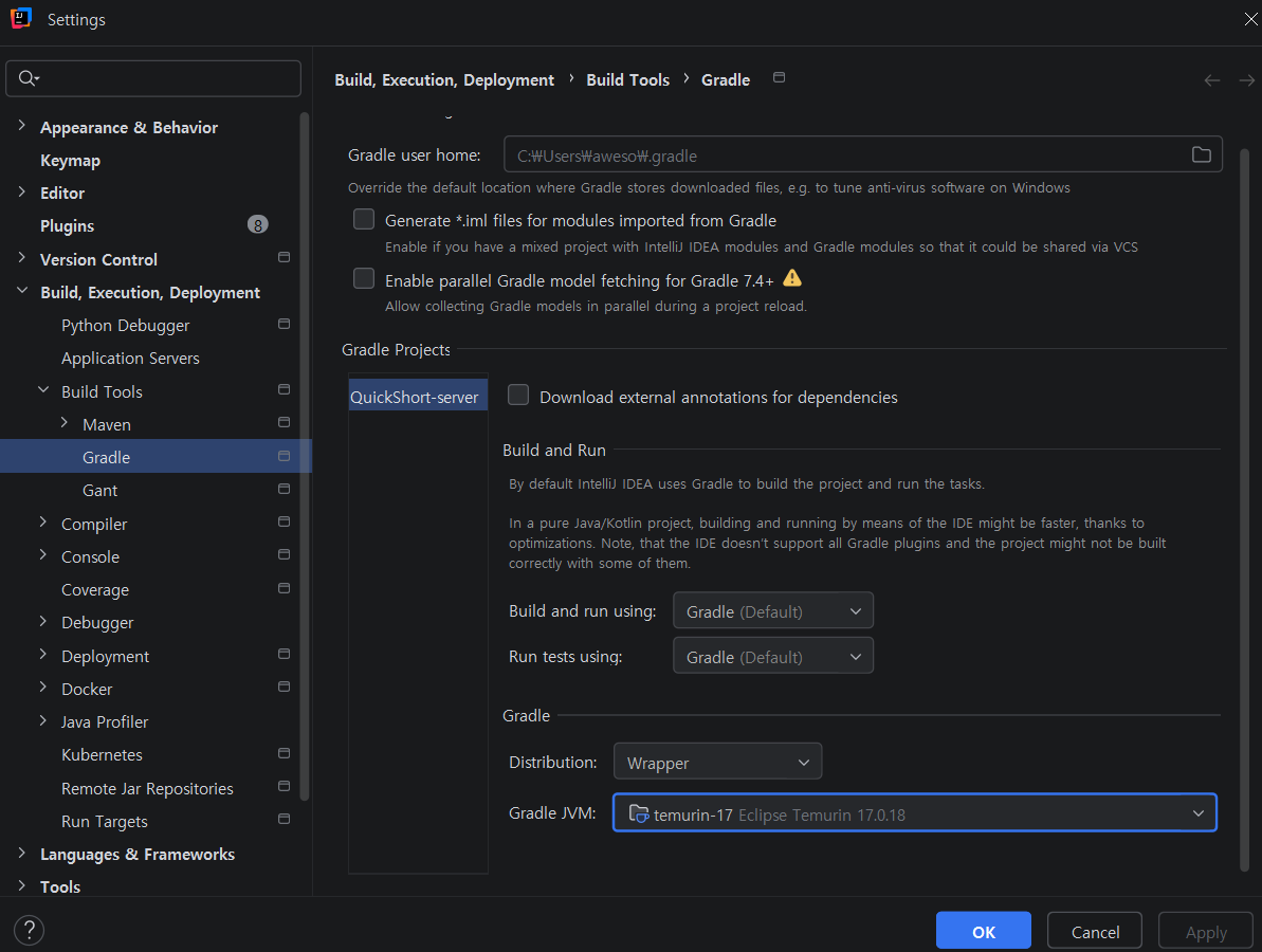 IntelliJ Settings → Build, Execution, Deployment → Gradle에서