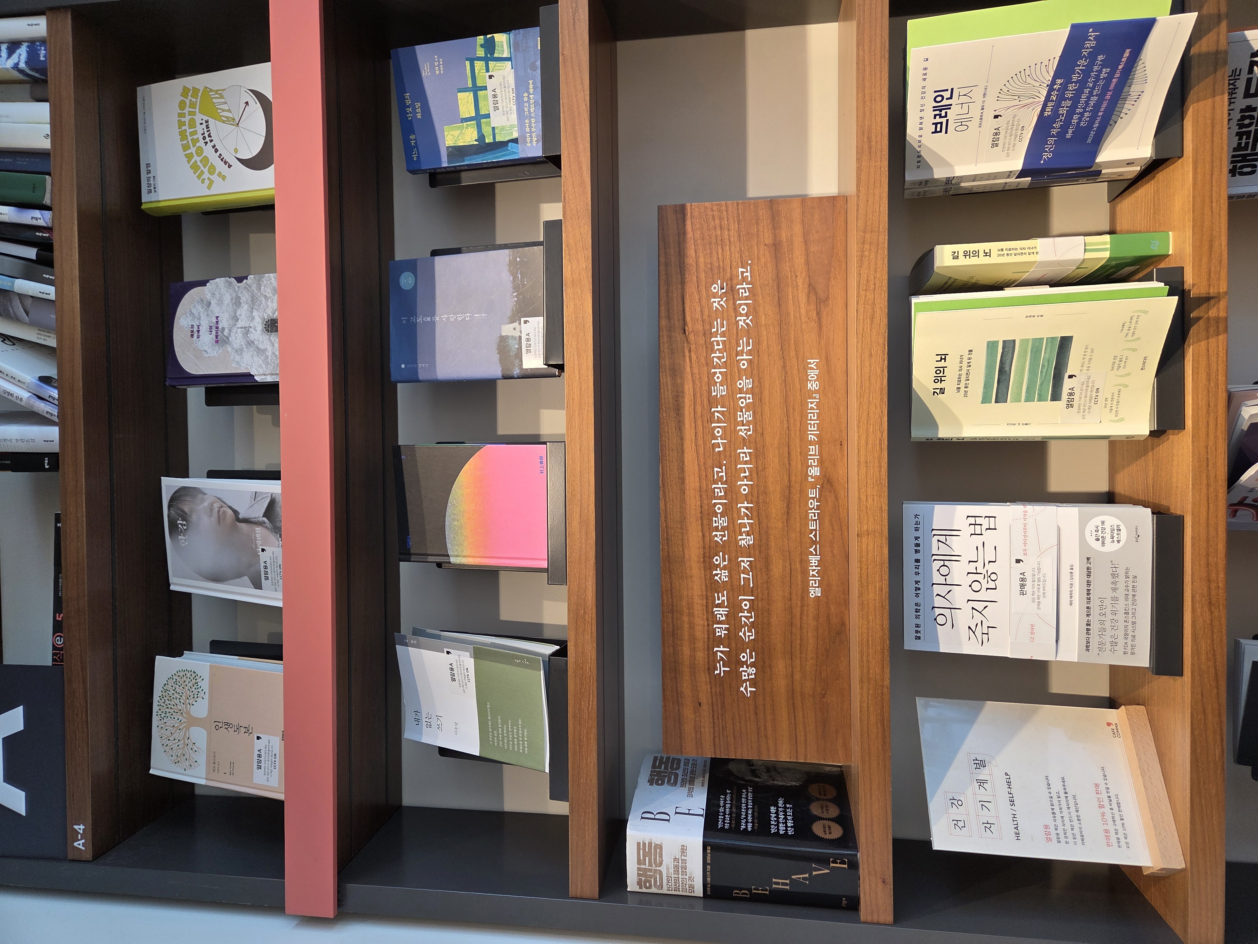 특히 인상적이었던 건 책 분류 방식이었다. 소설, 과학 이렇게 나누는 게 아니라 “ㅇㅇ할 때 읽는 책” 같은 방법으로 글귀와 함께 큐레이션 해놓은 게 참 좋았다. 와… 여기 완전 내 스타일이다 싶었다.