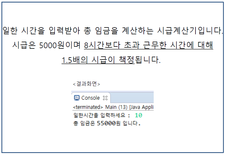 System.out.print("일한 시간을 입력하세요 : ");