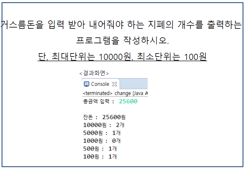 이런식으로 나누기를 해서 몫은 지폐의 개수, 나머지는 다시 지폐의 단위로 나눠주면 된다.