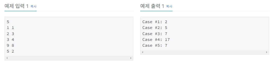 각 테스트 케이스마다 "Case #x: "를 출력한 다음, A+B를 출력한다. 테스트 케이스 번호는 1부터 시작한다.