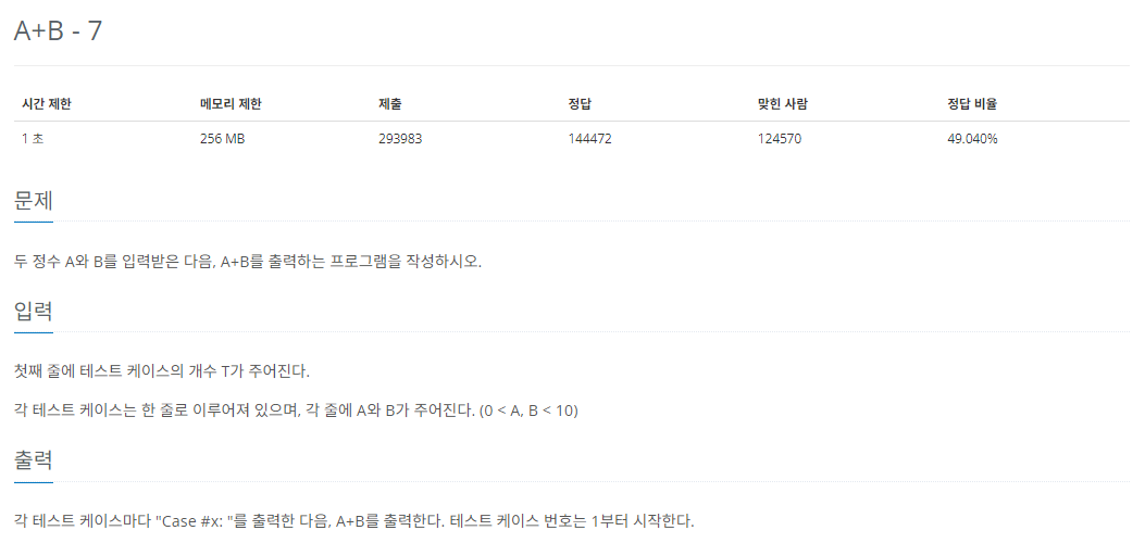 2. for문을 1부터 a까지 돌려주면서 정수 두 개를 입력받는다. 여기서 for문을 0부터로 설정하지 않은 이유는 각 테스트 케이스마다 "Case #x: "를 출력해야 하기 때문에 x를 i로 대체할 수 있기 때문이다.