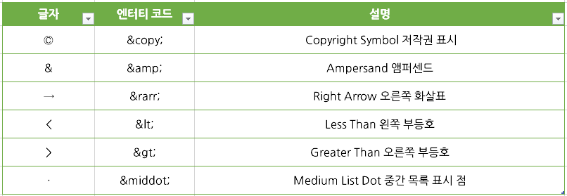 특수문자는 잘못된 표현으로 입력해도 화면에 반영은 되지만, 웹표준 코딩이 아니라서 &(엠퍼센트)로 시작하는 엔터티코드로 입력하는 것을 권장합니다.