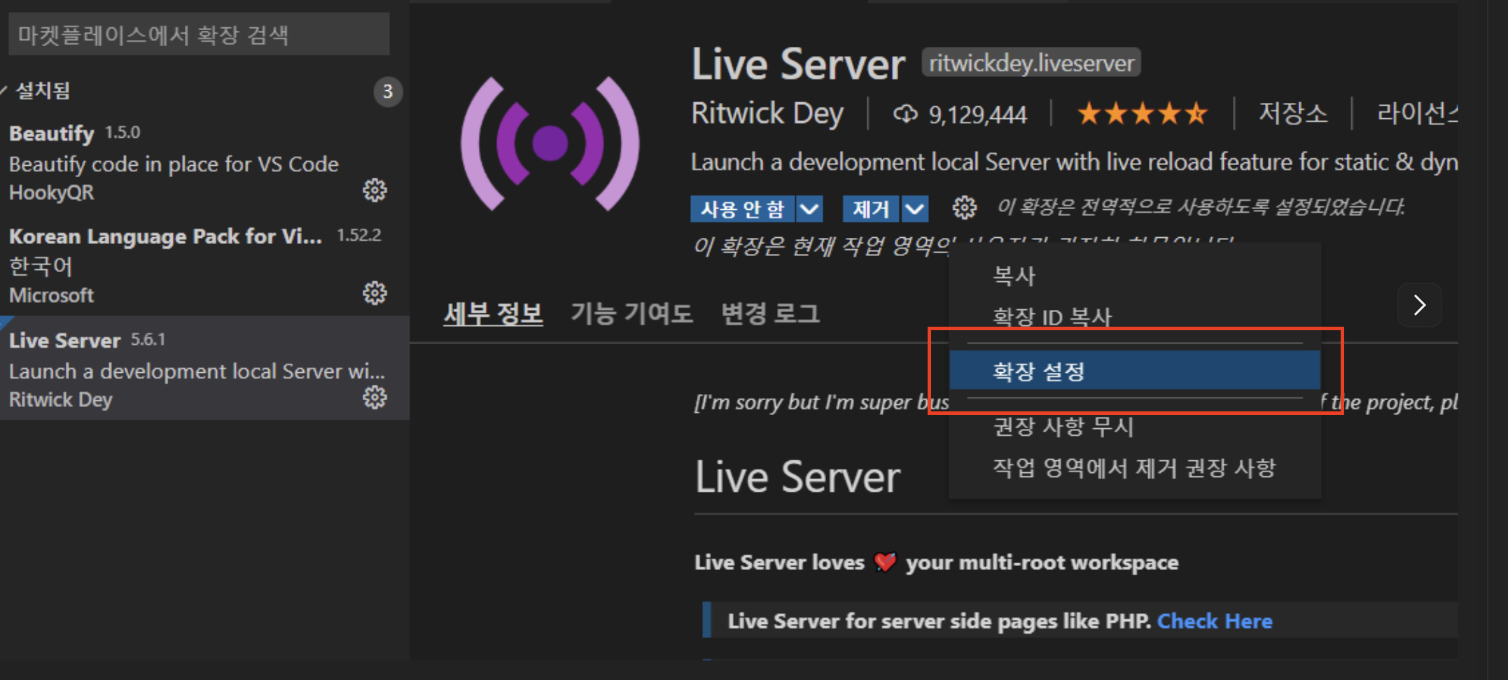 1. Extension > Live Server > 확장 설정 > Use Local IP 체크