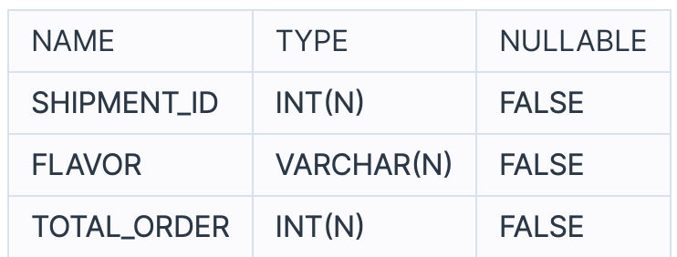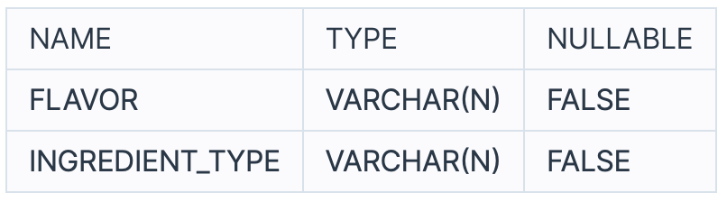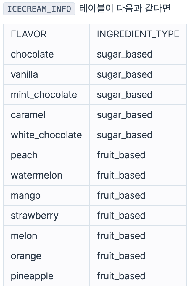 ICECREAM_INFO 테이블 구조는 다음과 같으며, FLAVOR, INGREDITENT_TYPE 은 각각 아이스크림 맛, 아이스크림의 성분 타입을 나타냅니다. INGREDIENT_TYPE에는 아이스크림의 주 성분이 설탕이면 sugar_based라고 입력되고, 아이스크림의 주 성분이 과일이면 fruit_based라고 입력됩니다. ICECREAM_INFO의 기본 키는 FLAVOR입니다. ICECREAM_INFO테이블의 FLAVOR는 FIRST_HALF 테이블의 FLAVOR의 외래 키입니다.