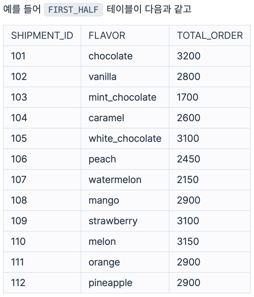 다음은 아이스크림 가게의 상반기 주문 정보를 담은 FIRST_HALF 테이블과 아이스크림 성분에 대한 정보를 담은 ICECREAM_INFO 테이블입니다. FIRST_HALF 테이블 구조는 다음과 같으며, SHIPMENT_ID, FLAVOR, TOTAL_ORDER 는 각각 아이스크림 공장에서 아이스크림 가게까지의 출하 번호, 아이스크림 맛, 상반기 아이스크림 총주문량을 나타냅니다. FIRST_HALF 테이블의 기본 키는 FLAVOR입니다.