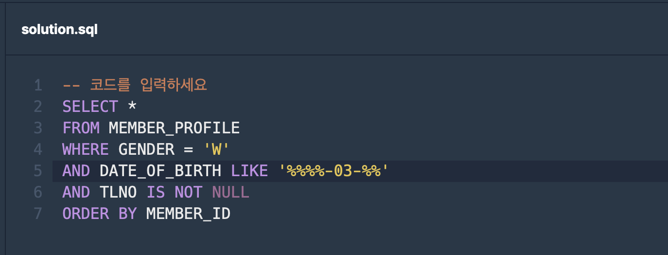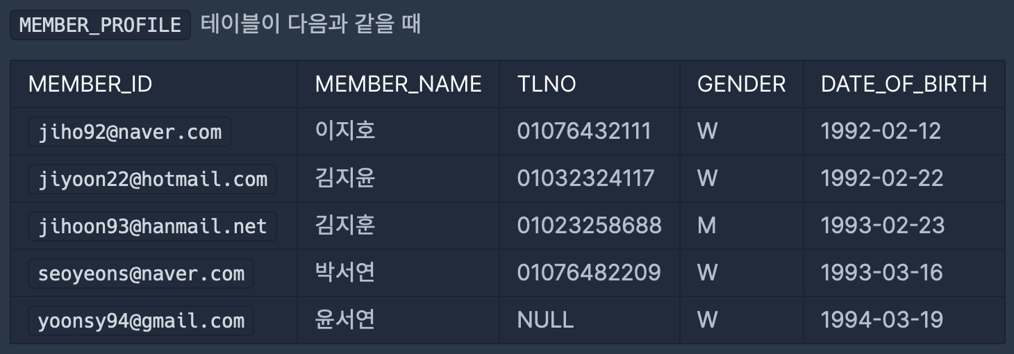 다음은 식당 리뷰 사이트의 회원 정보를 담은 MEMBER_PROFILE 테이블입니다. MEMBER_PROFILE 테이블은 다음과 같으며 MEMBER_ID, MEMBER_NAME, TLNO, GENDER, DATE_OF_BIRTH는 회원 ID, 회원 이름, 회원 연락처, 성별, 생년월일을 의미합니다.