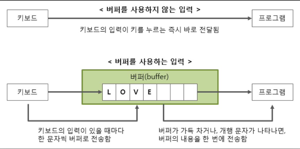 반면 버퍼를 사용하는 입력은, 키보드의 입력이 있을 때마다 한 문자씩 버퍼로 전송한다.