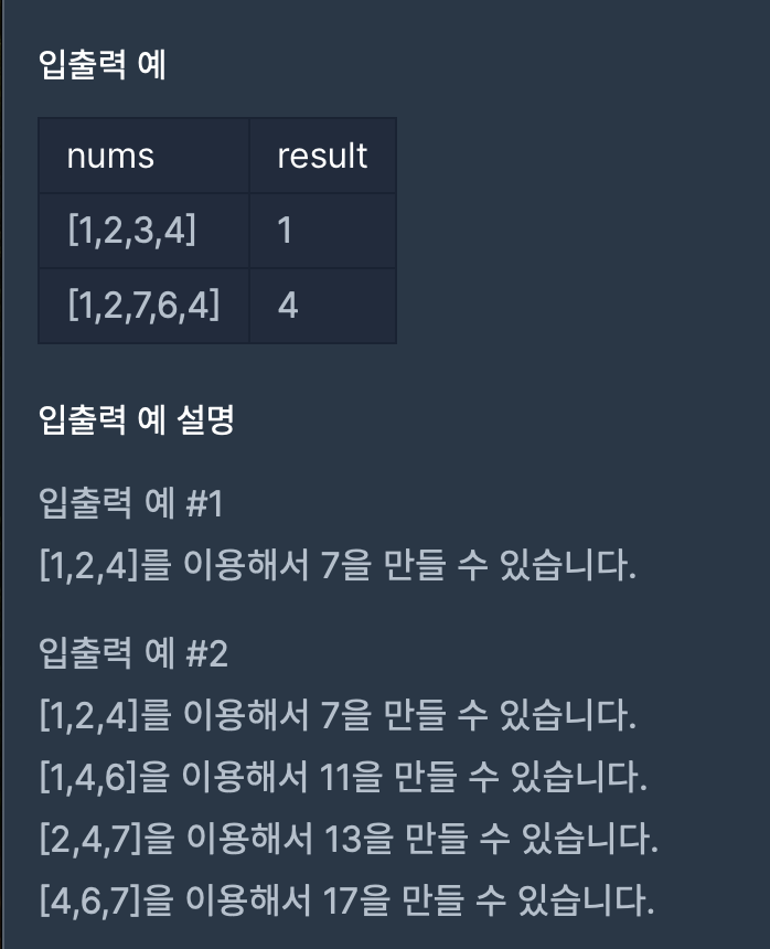 주어진 숫자 중 3개의 수를 더했을 때 소수가 되는 경우의 개수를 구하려고 합니다. 숫자들이 들어있는 배열 nums가 매개변수로 주어질 때, nums에 있는 숫자들 중 서로 다른 3개를 골라 더했을 때 소수가 되는 경우의 개수를 return 하도록 solution 함수를 완성해주세요.