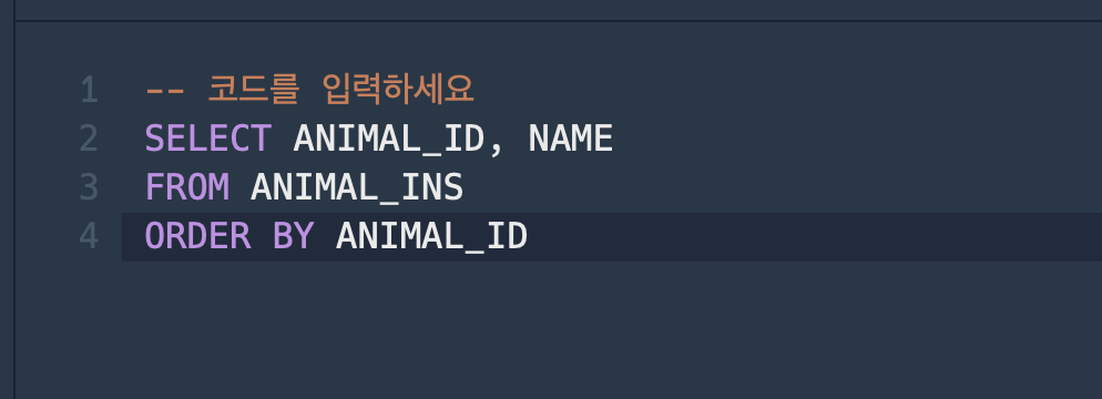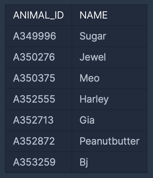 동물 보호소에 들어온 모든 동물의 아이디와 이름을 ANIMAL_ID순으로 조회하는 SQL문을 작성해주세요. SQL을 실행하면 다음과 같이 출력되어야 합니다.