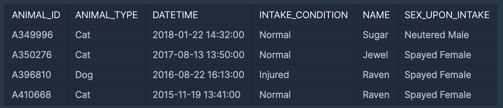 - 'Raven'이라는 이름을 가진 개와 고양이가 있으므로, 이 중에서는 보호를 나중에 시작한 개를 먼저 조회합니다.