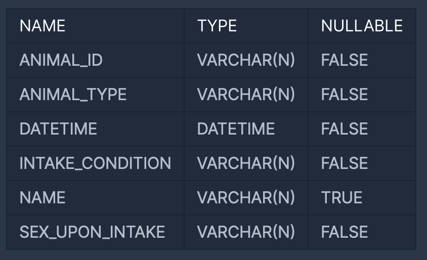 ANIMAL_INS 테이블은 동물 보호소에 들어온 동물의 정보를 담은 테이블입니다. ANIMAL_INS 테이블 구조는 다음과 같으며, ANIMAL_ID, ANIMAL_TYPE, DATETIME, INTAKE_CONDITION, NAME, SEX_UPON_INTAKE는 각각 동물의 아이디, 생물 종, 보호 시작일, 보호 시작 시 상태, 이름, 성별 및 중성화 여부를 나타냅니다.