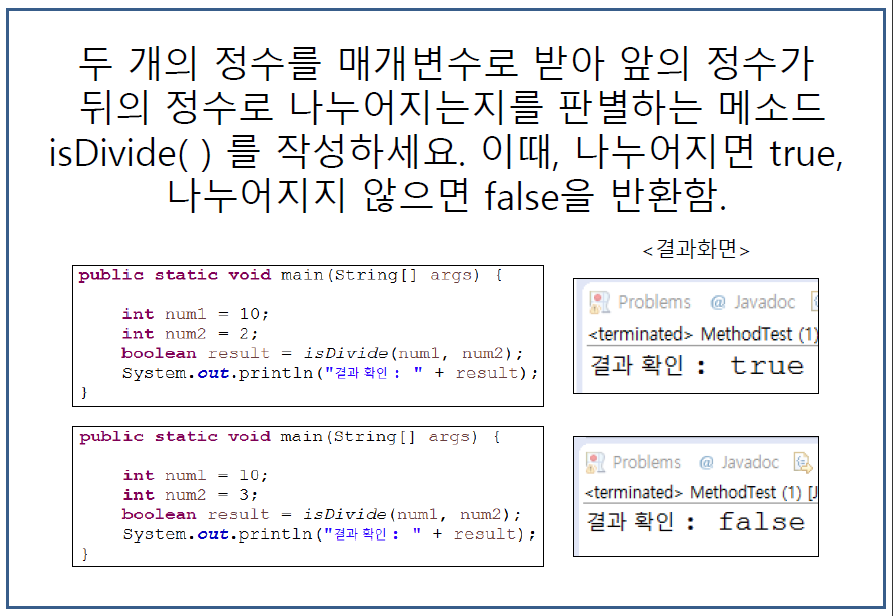 두 개의 정수를 매개변수로 받아 앞의 정수가 뒤의 정수로 나누어지는지를 판별하는 메소드 isDivide()를 작성하세요.