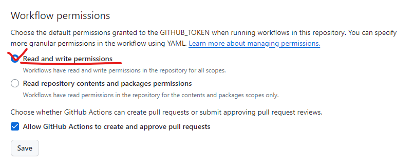 2. 여기서 하단의 Workflow permissions => Read and write permissions 에 체크 해 주면 끝!!
