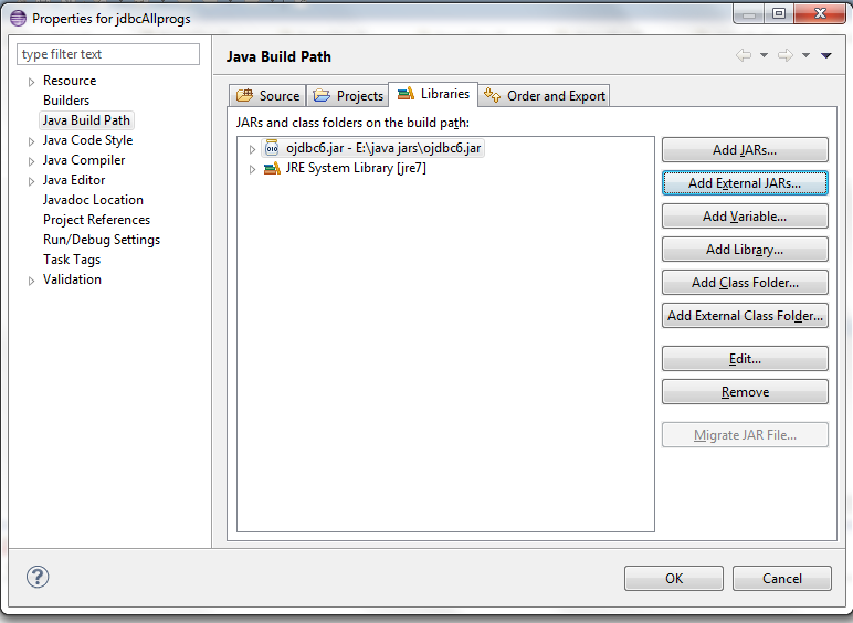 (2) 프로젝트에 ojdbc6.jar파일 추가했는지 확인. (버전마다 jar 파일 이름 다름)