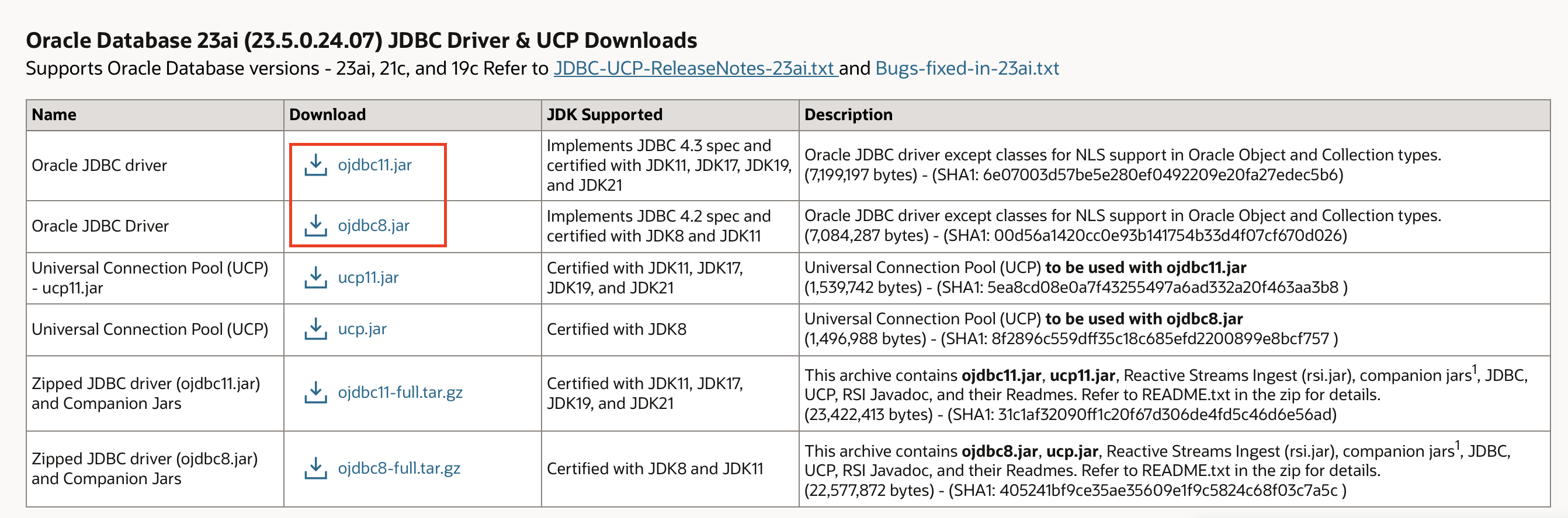 Oracle JDBC Driver Implements JDBC 4.2 spec and certified with JDK8, JDK11, JDK17, and JDK19 Oracle JDBC driver except classes for NLS support in Oracle Object and Collection types. (4,535,061 bytes) - (SHA1: f46bbf6c42210736236e81bb18a955e3e1aa9a88)