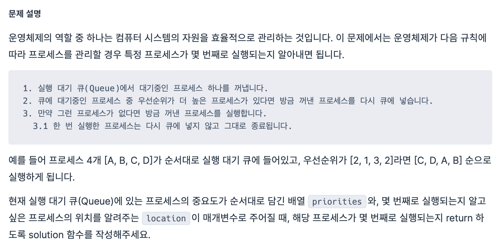 만약 priorities = [2, 1, 3, 2]이고 location = 2라면, location이 가리키는 프로세스는 3이다. 3보다 우선순위가 높은 프로세스가 없으므로 3을 첫번째로 처리한다. 그래서 cnt는 1이 된다. location == 0 체크하는 이유는 만약 처리한 프로세스가 내가 추적하는 프로세스(인덱스 2)라면, 이때 cnt를 반환해서 3이 1번째로 출력되었다고 알려 주기 위해서이다.