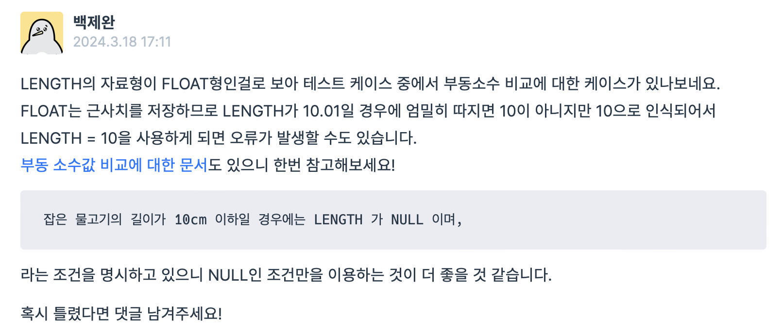 하지만 나도 문제를 처음 읽었을 때는 길이 값과 숫자가 나오니까 IFNULL이랑 비교 연산자를 써서 코드를 짜자는 생각이 들었다. 그래서 처음에 쿼리문에 10cm 이하를 나타나는 기호인 LEGNTH <= 10 을 써 줬다. 답은 그래서 테스트 2가 통과되지 못한 것이다. 여기서 등호(`=`)가 들어가면 틀린다. < 10 이라고 쓰면 정답 인정이 된다.