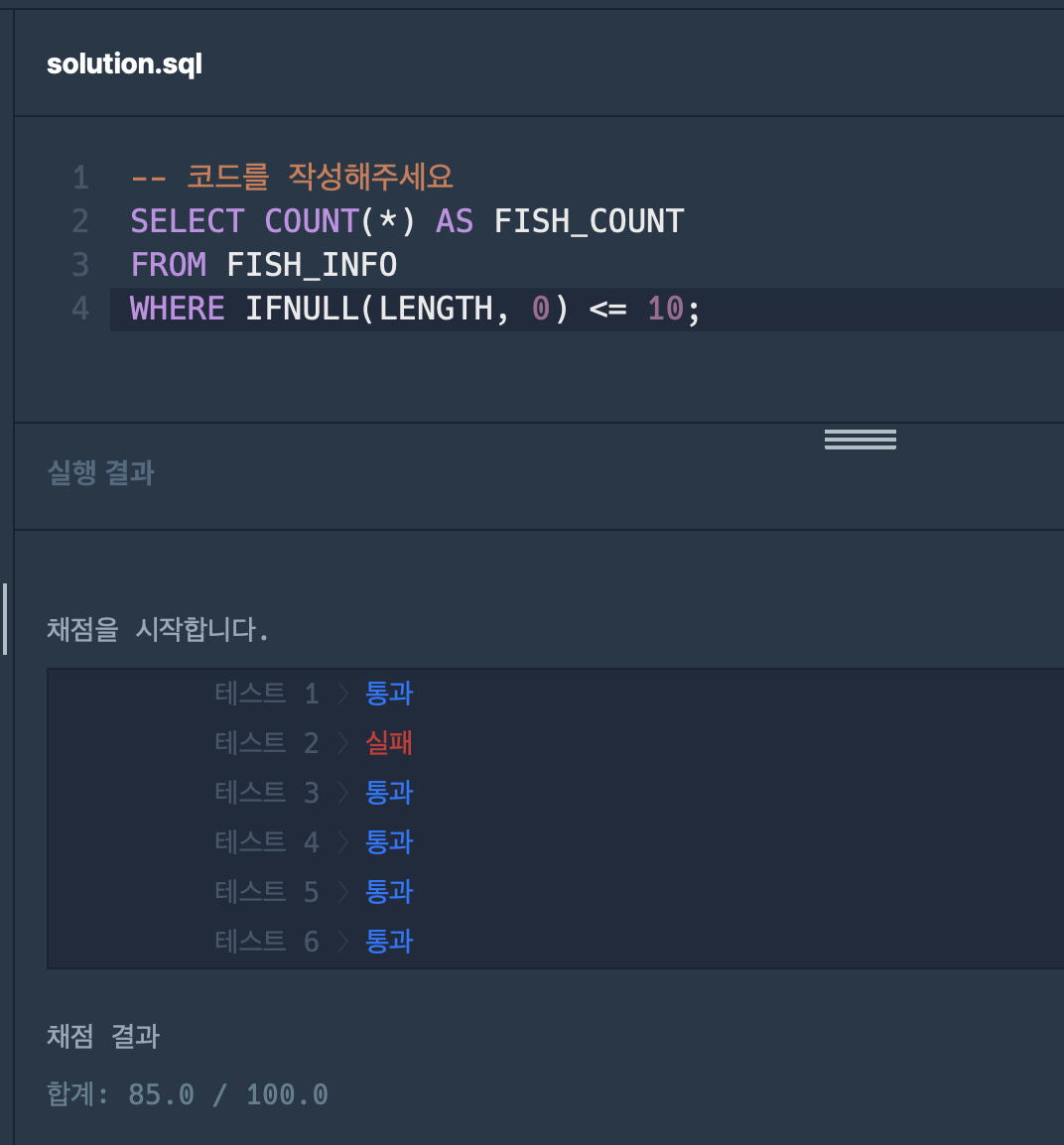LENGTH 컬럼에 NULL값이 들어가 있으면 비교 연산이 안 되기 때문에 IFNULL로 NULL인 요소를 0으로 바꿀 수 있도록 해 주었다. 결과는 CNT만 출력 하고 결과값이 맞아서 통과인데 테스트 2가 틀린것이 거슬렸다. 정답코드는 맞지만 출력결과창에서 테스트케이스 2에 왜 실패가 떴는지 궁금해졌다.