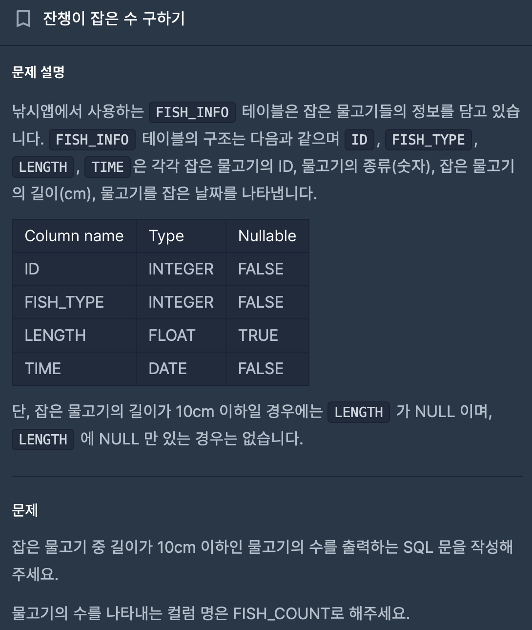 원래는 문제에서 길이가 10cm 이하인 물고기의 LENGTH 값은 NULL로 설정된다고 했으므로, 길이가 10cm 이하인 물고기를 찾을 때는 LENGTH가 NULL인 행만 찾으면 된다. 그래서 WHERE LENGTH IS NULL만 해 주면 되는 간단한 문제이다.