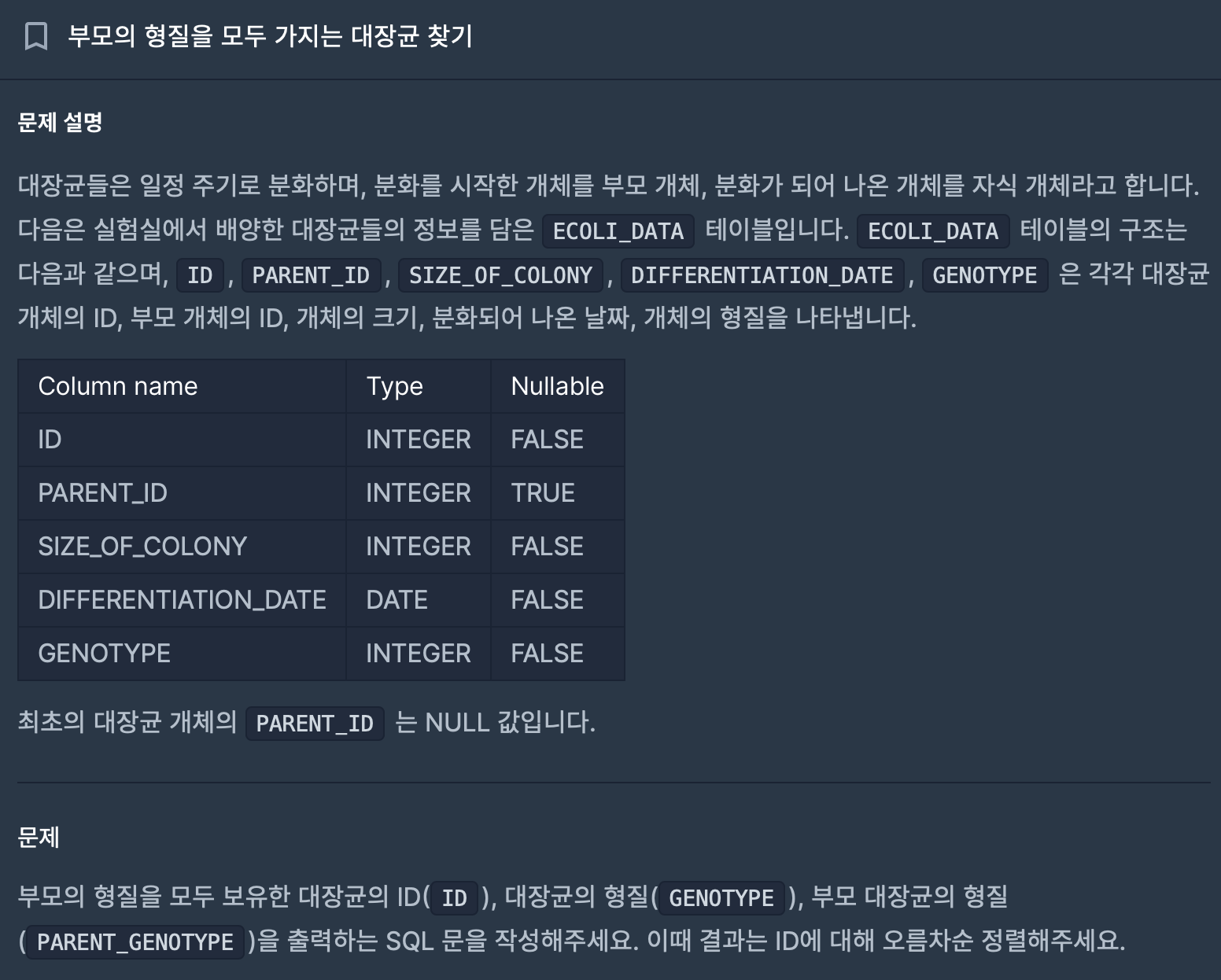이 문제에서도 하나의 테이블에 부모의 아이디와 자식의 아이디, 개체의 형질(GENOTYPE)이 모두 들어 있다. 부모의 테이블은 P로, 자식의 테이블은 그냥 A라고 별칭을 준 뒤 자식테이블의 PARENT_ID컬럼을 부모 테이블의 ID 값으로 조인 한다. 그 후 WHERE 절에 `A.GENOTYPE & P.GENOTYPE = P.GENOTYPE` 라는 조건을 주면 된다. 부모의 형질을 모두 보유한 대장균을 찾으라고 했기 때문에 자식의 형질과 부모의 형질을 비트연산해서 부모의 형질값과 매칭되는지 비교 해 주는 것이다.