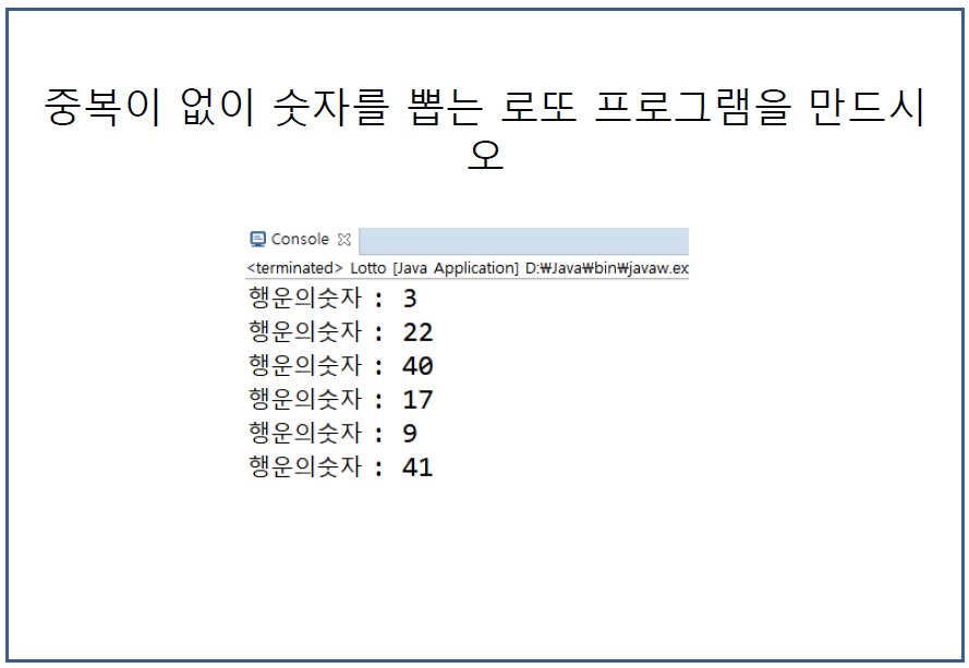 중복이 없이 숫자를 뽑는 로또 프로그램을 만드시오