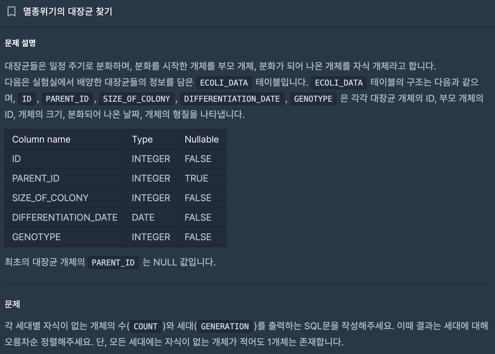 ECOLI_DATA는 부모-자식간의 계층 관계를 이루고 있기 때문에 각 세대별로 자식이 없는 개체의 수를 출력하려면 재귀 CTE를 사용해서 대장균의 세대generation)를 계산해 주어야 한다. WITH RECURSIVE 블록을 먼저 지정 해 주고, 블록 바깥에서 세대별로 자식이 없는 개체수를 조회하는 쿼리를 짜 주면 된다.