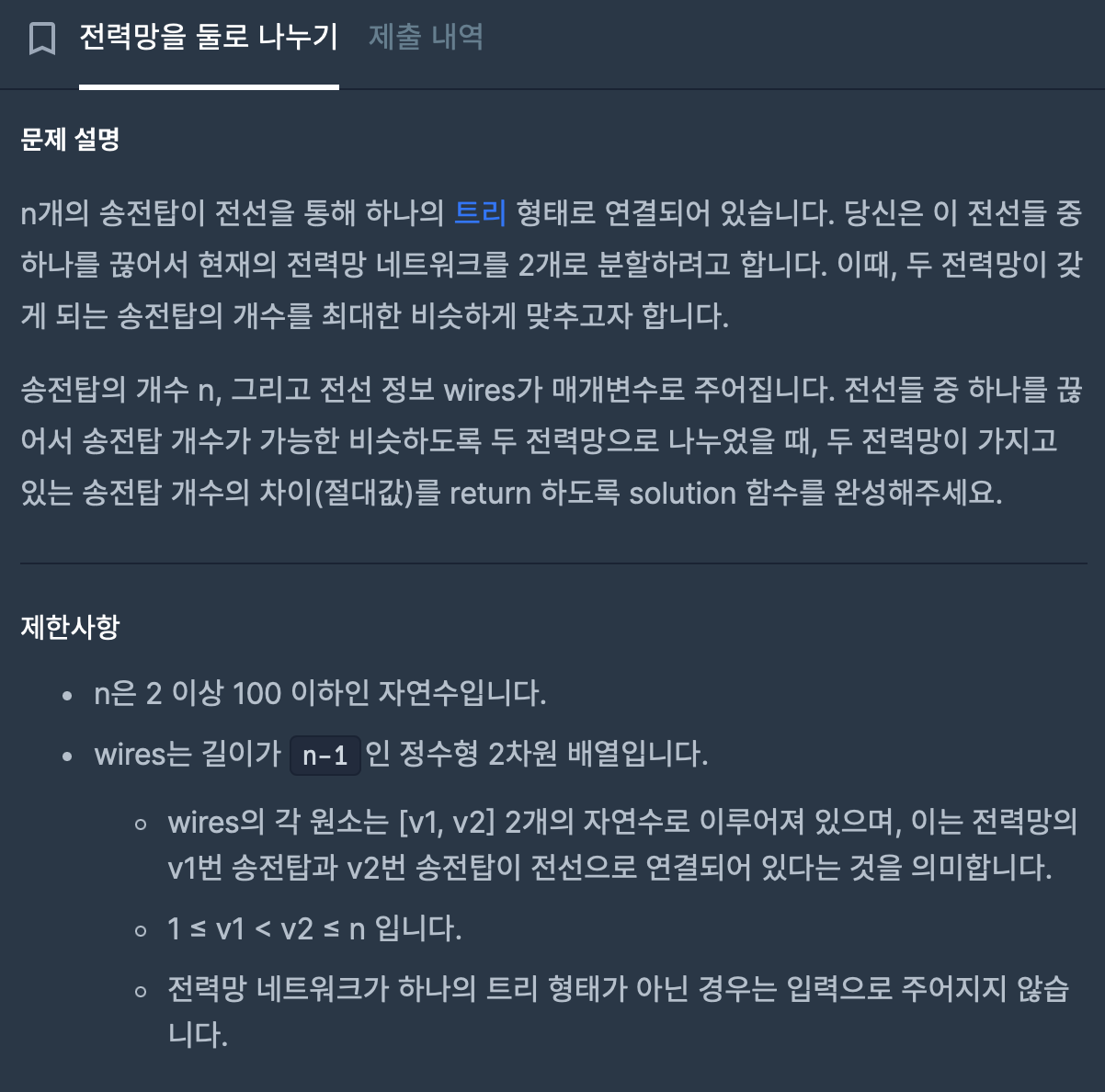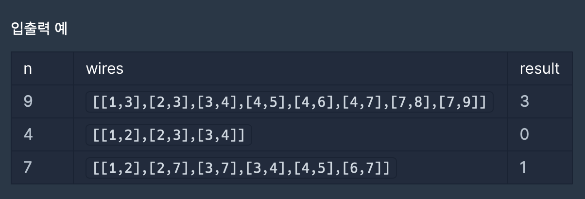 트리 탐색을 해 주면 되는데 이 문제에서는 최적이나 최소값 구하는게 아니기 때문에 `깊이 우선 탐색(DFS)`을 사용하면 된다. 전체 전력망에 대해 깊이 우선 탐색을 하면서 자식 노드의 수를 계산해서