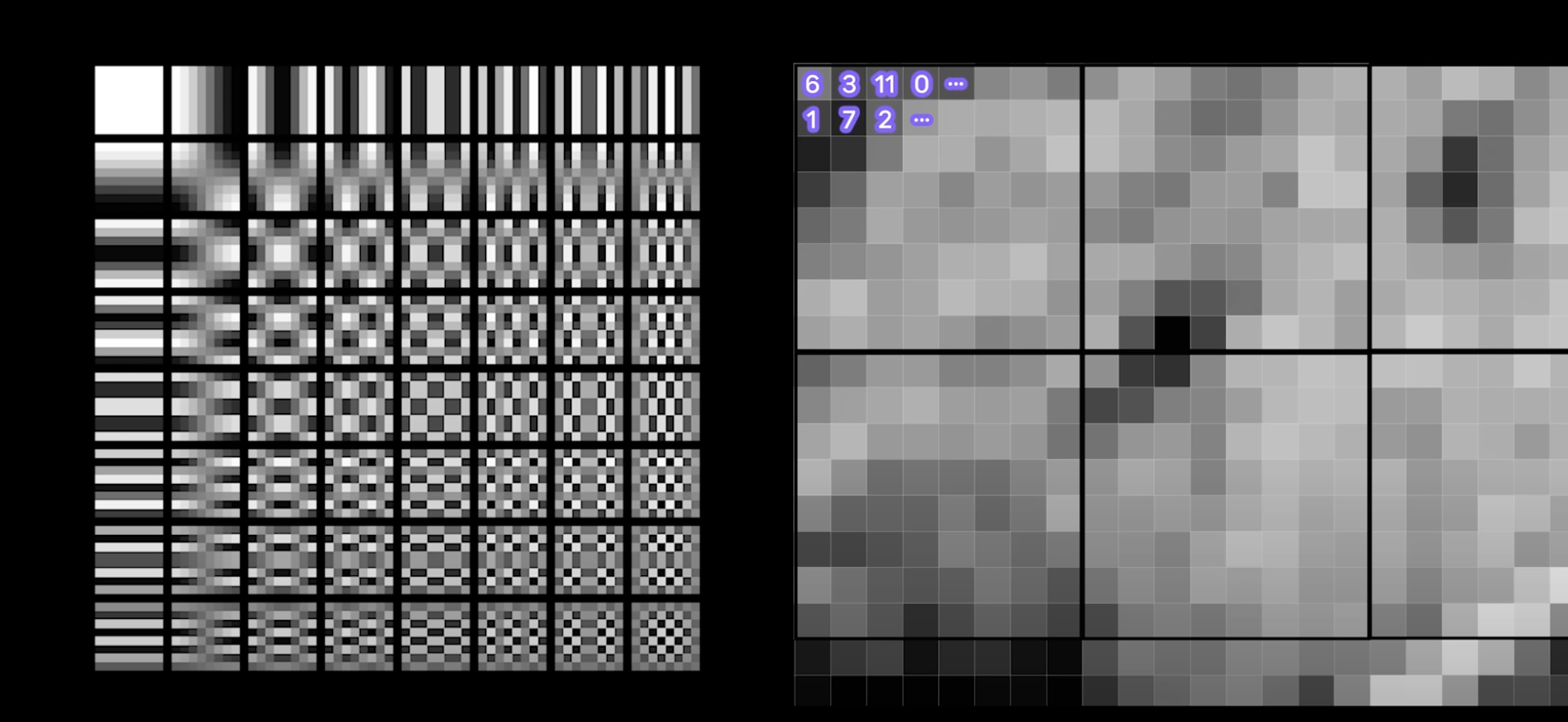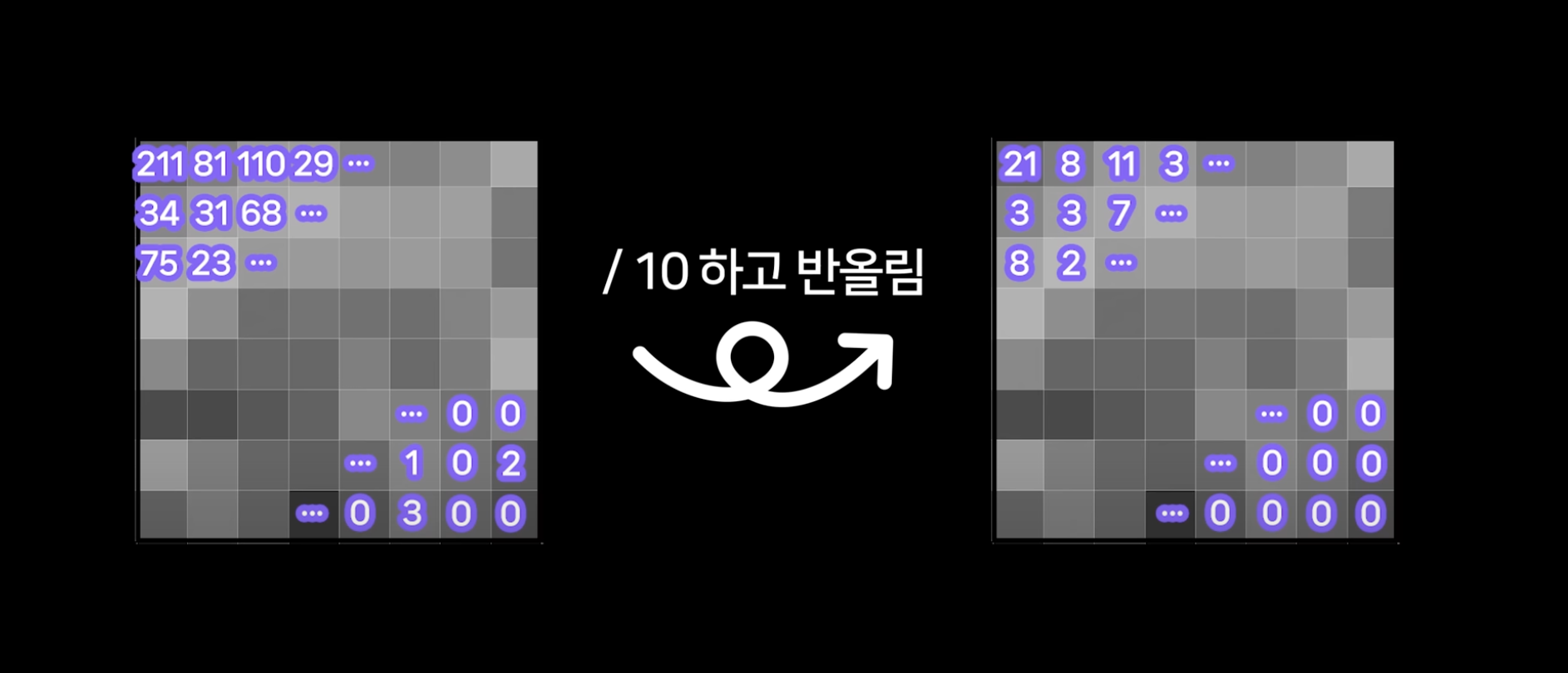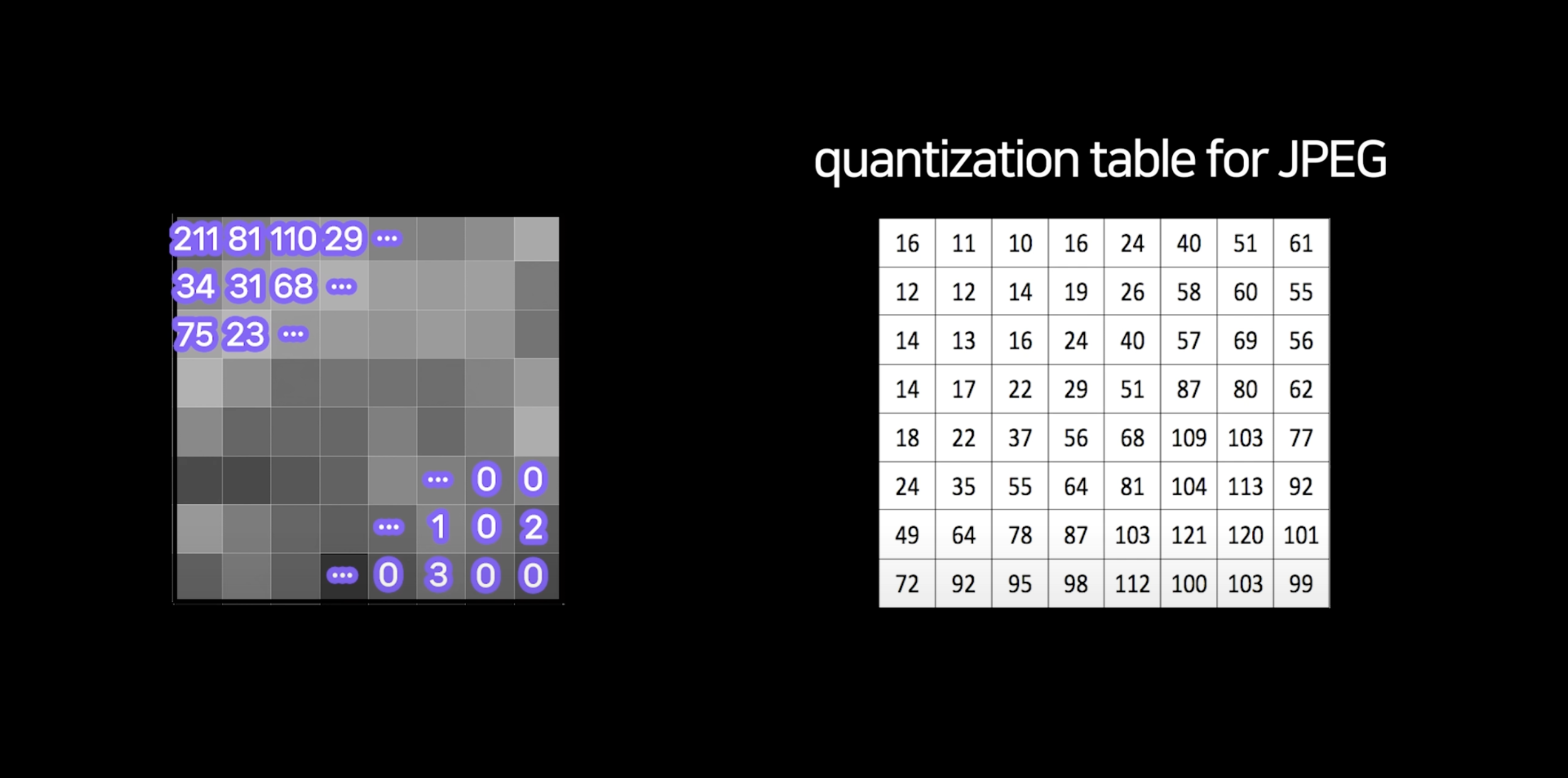 중요한 패턴들은 10보다 낮은 숫자, 안 중요한 패턴은 높은 숫자로 나눠주면 이미지 화질이나 압축률이 계산된다.