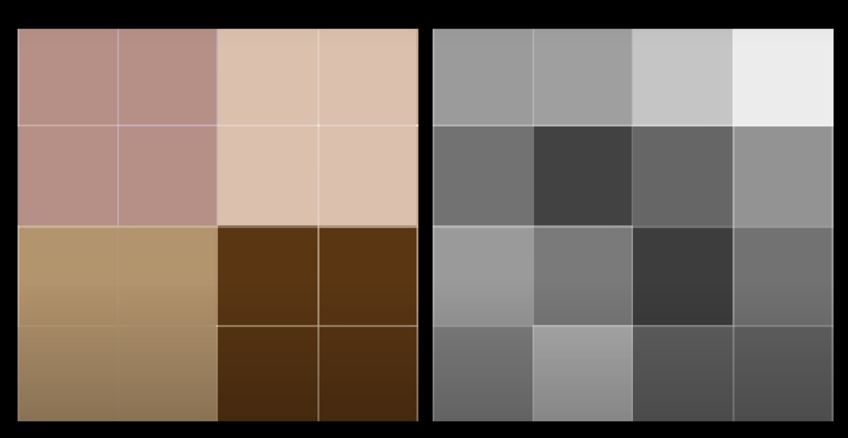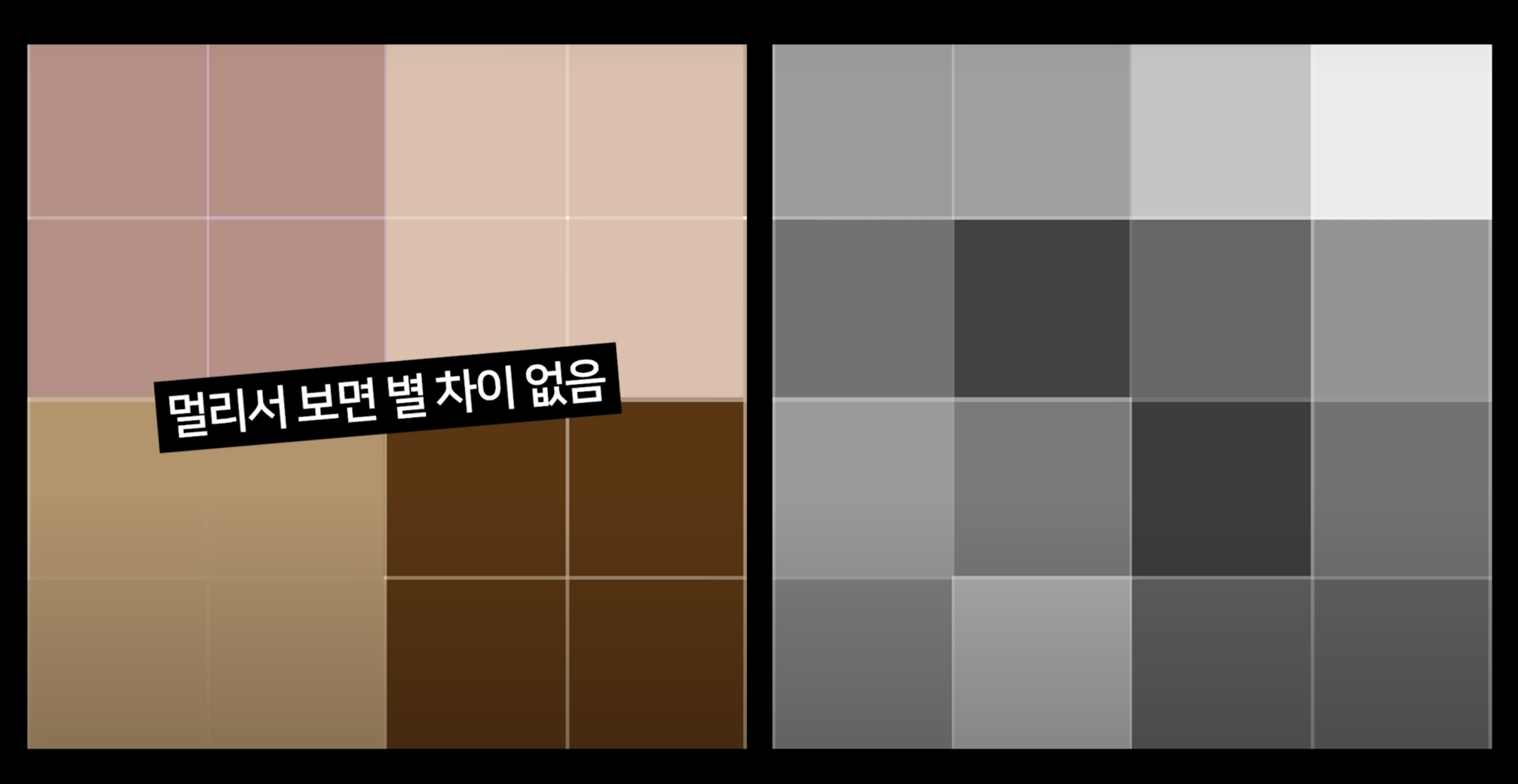 그렇기 때문에 이미지의 밝기는 그대로 두고 이미지의 색상 부분만 추출하고 인접한 픽셀을 그냥 하나의 색으로 칠해버린다. 즉, 이런 식으로 색을 뭉개버려도 사람의 눈은 큰 차이를 느끼지 못한다.