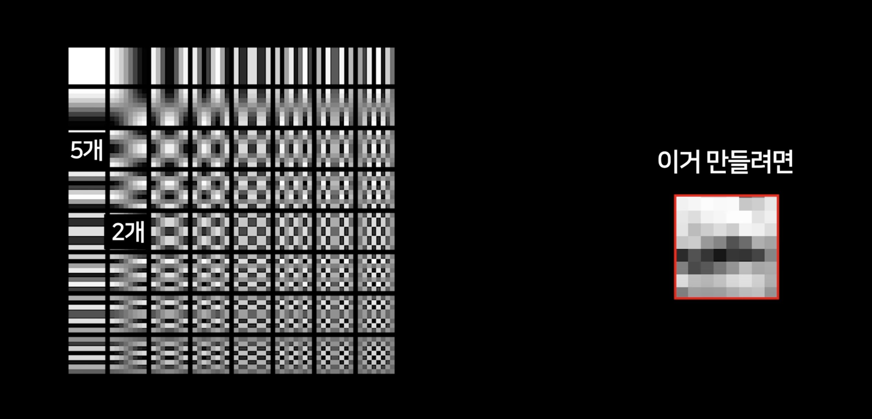 전문 용어로 말하면 푸리에 변환(Fourier transform, FT)을 하는 것이다. 시간이나 공간에 대한 함수를 시간 또는 공간 주파수 성분으로 분해하는 변환을 말한다. 이걸 하려면 이미지를 8*8픽셀로 자르고, 해당 구역은 패턴들을 각각 몇개씩 써야 재현할 수 있는지 기록을 해 두는 것이다.