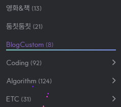 - 마우스를 올리고 있는 해당 카테고리명은 연한 보라색에서 민트색으로 불이 들어온것처럼 변함