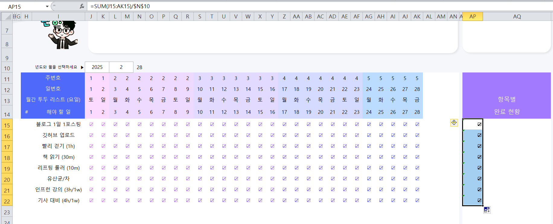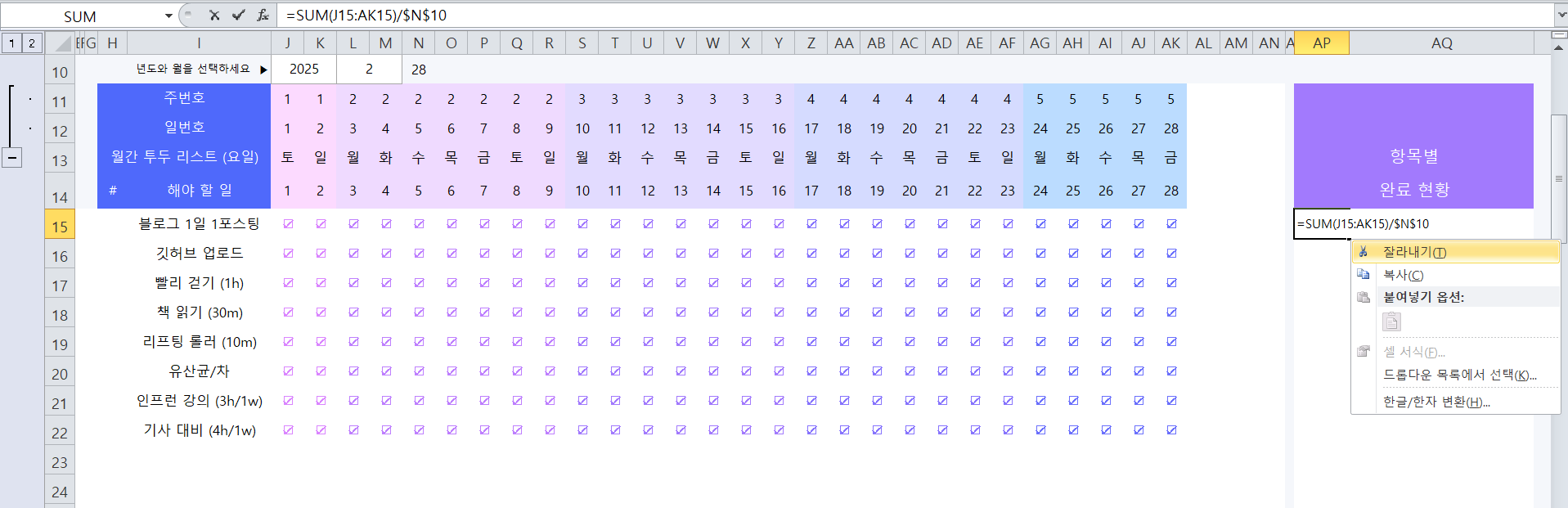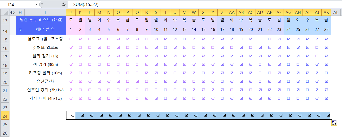 맨 아래 칸에 SUM 함수를 이용해서 하루에 몇 개의 항목을 완료했는지 진행 상황을 합산 해준다.