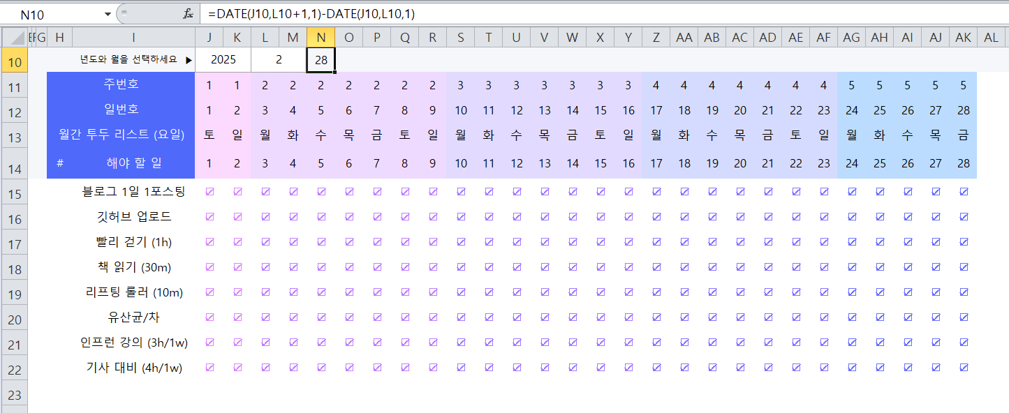 먼저 `연도/월` 선택목록,`주번호`, `일번호`, `요일`, `해야할일(날짜)` 란을 만들어서 해당 칸을 채워준다. 위의 표를 만드는 법은 아래 포스팅 참조 [엑셀] 채우기 핸들과 date, text 함수로 날짜