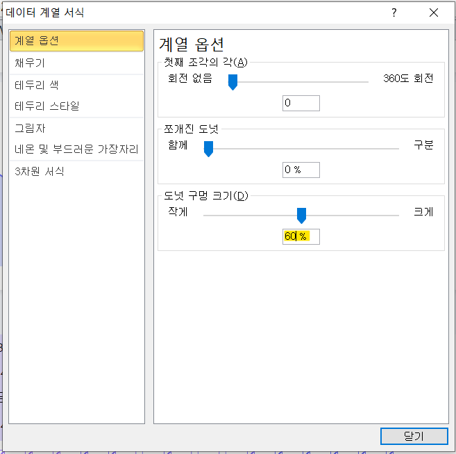 차트 우클릭 > 데이터 계열 서식 > 도넛구멍크기 60%로 설정