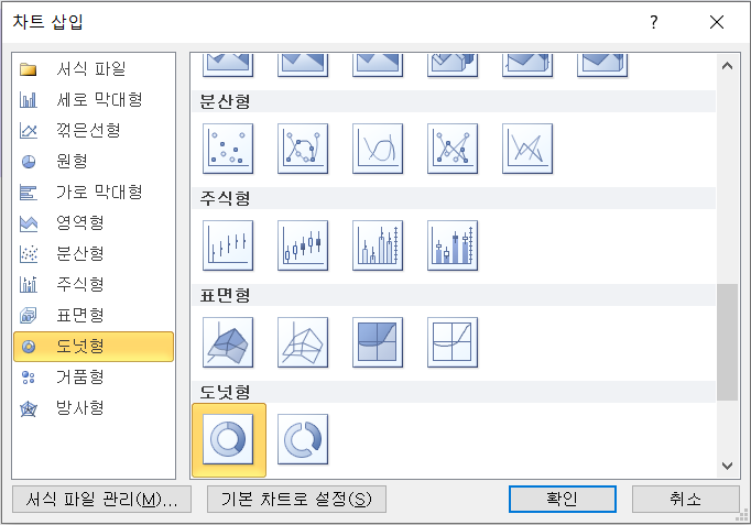이 두 셀을 선택한 상태에서 삽입 > 기타 차트 > 도넛형 차트