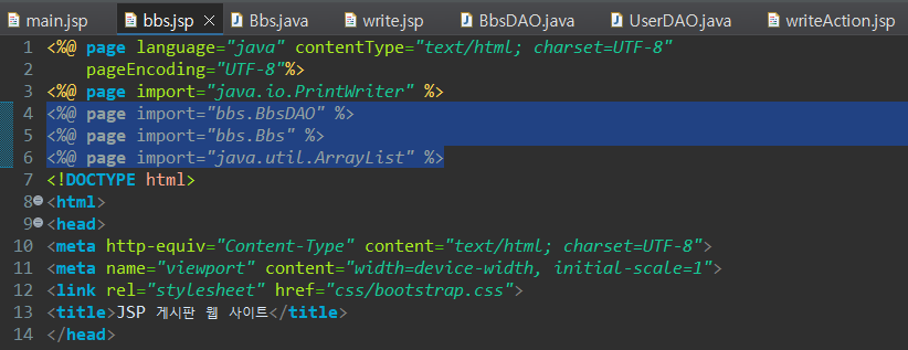 이제 body 안에 스크립트릿 열어서 bbsDAO 객체 생성해 주고 ArrayList로 글 내용들을 불러온다.