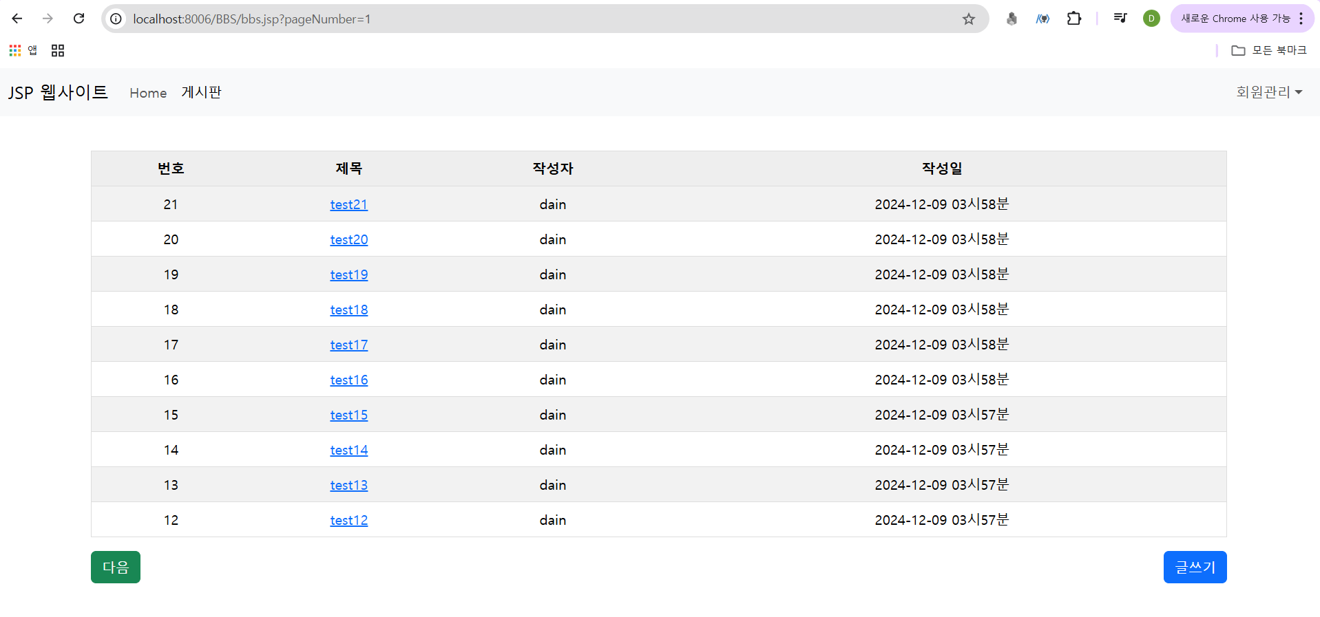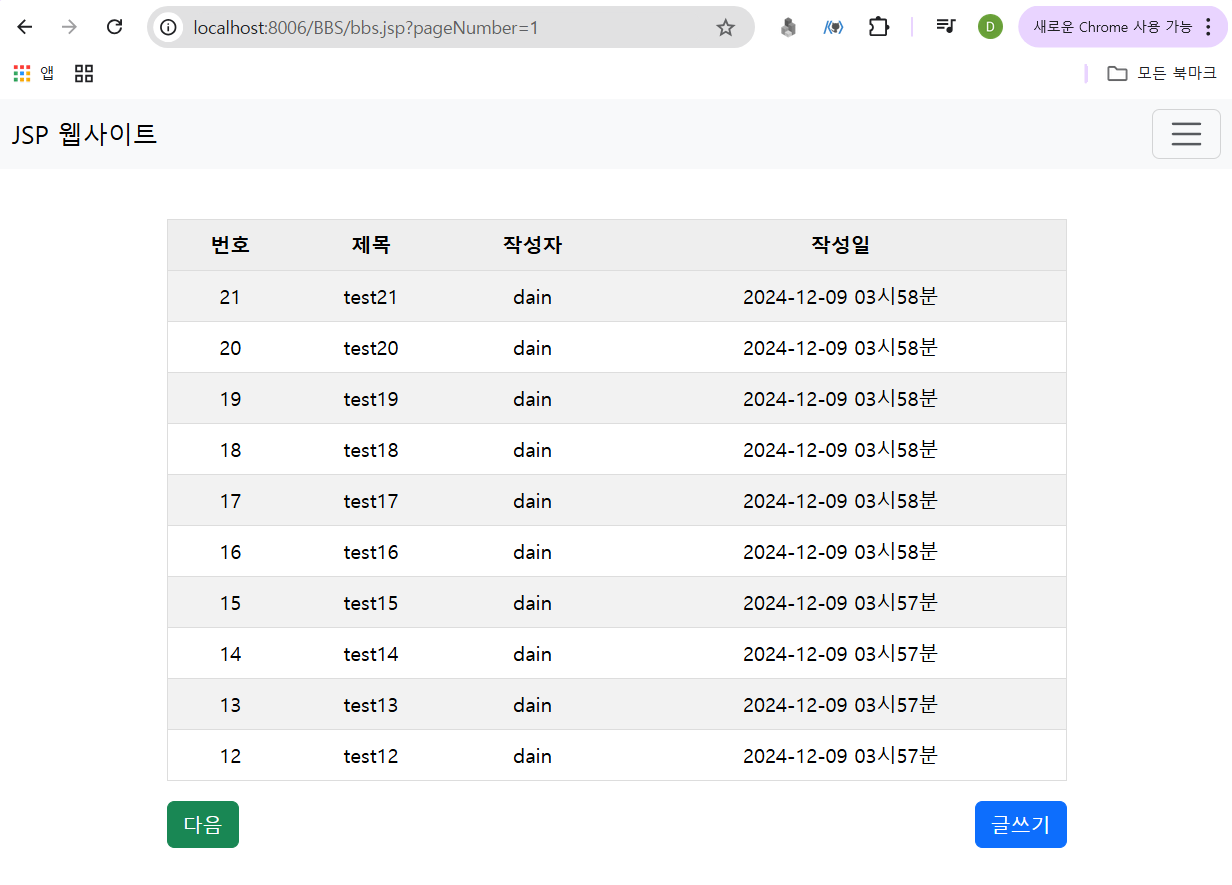 페이지 1은 psmt.setInt(1, 100) → 100번 게시글부터 10개 가져오기 때문에 결과적으로 100번, 99번, 98번, ... 이렇게 내림차순으로 10개의 게시글이 반환된다.